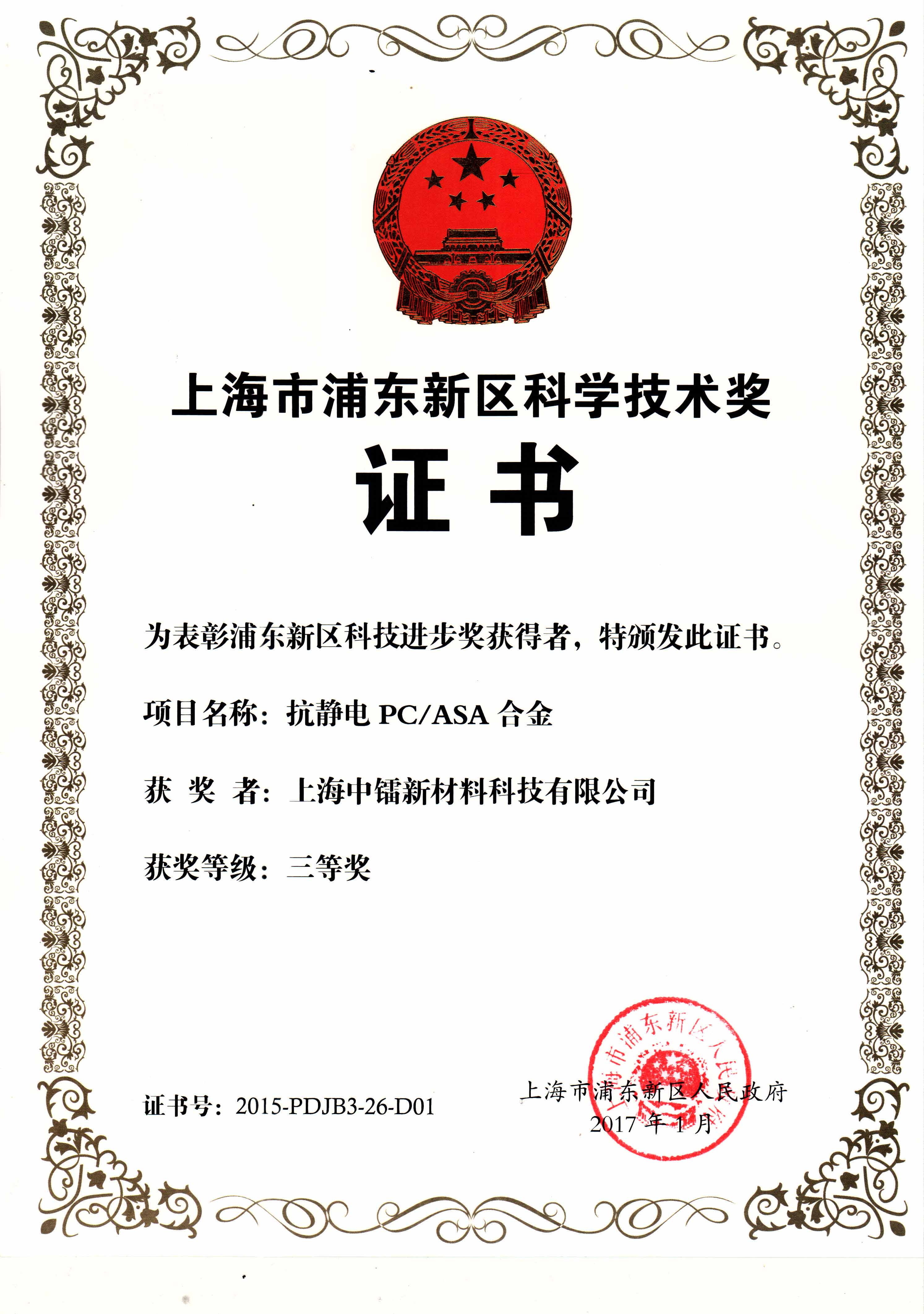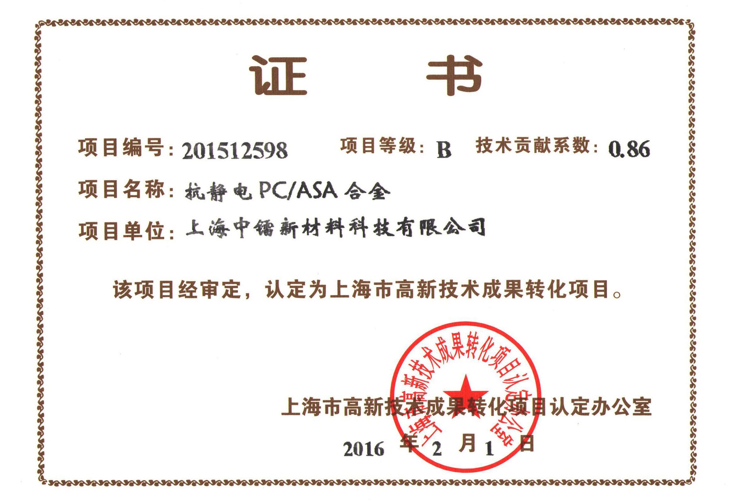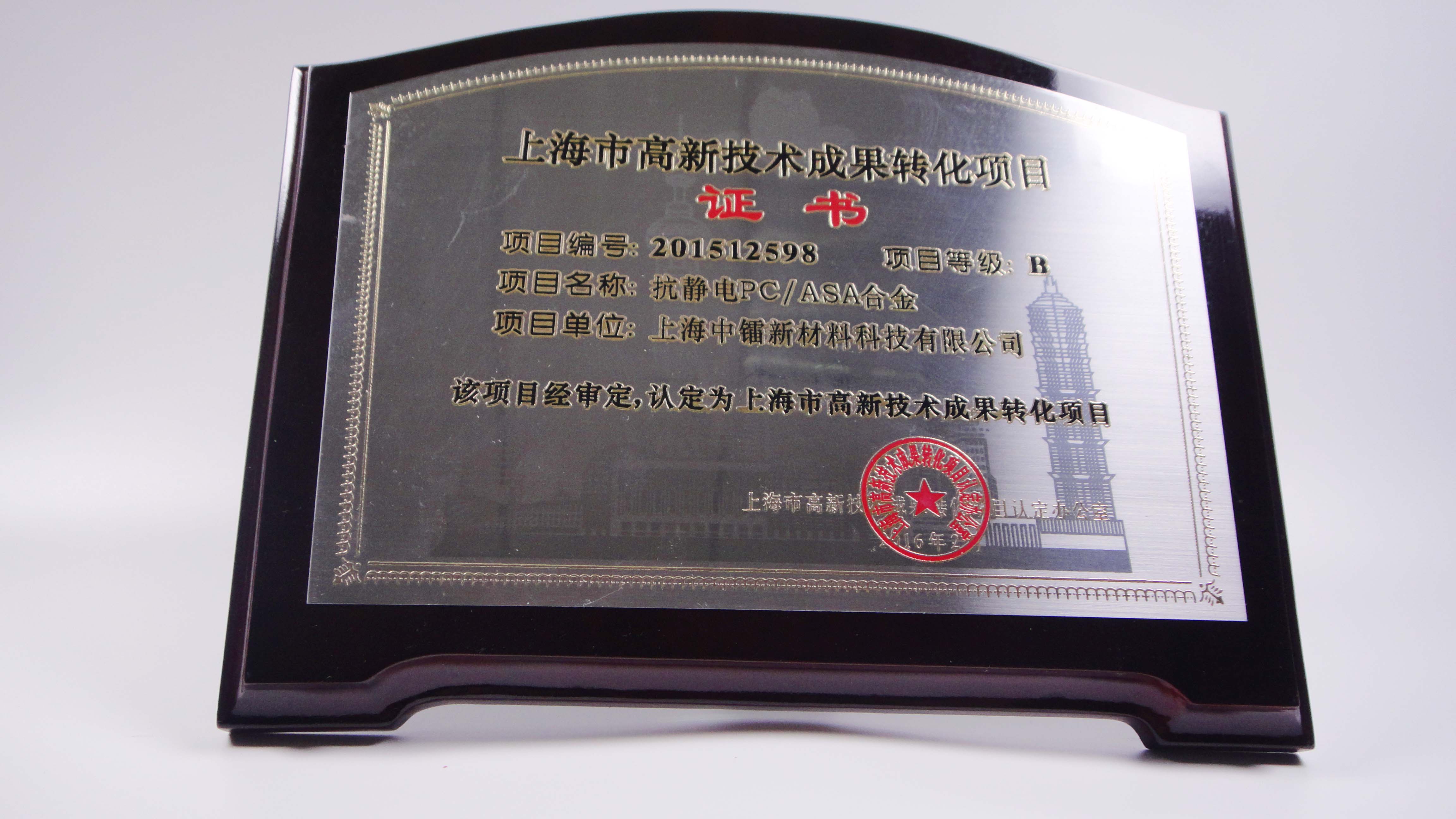 抗靜電PC ASA成果轉(zhuǎn)化證書