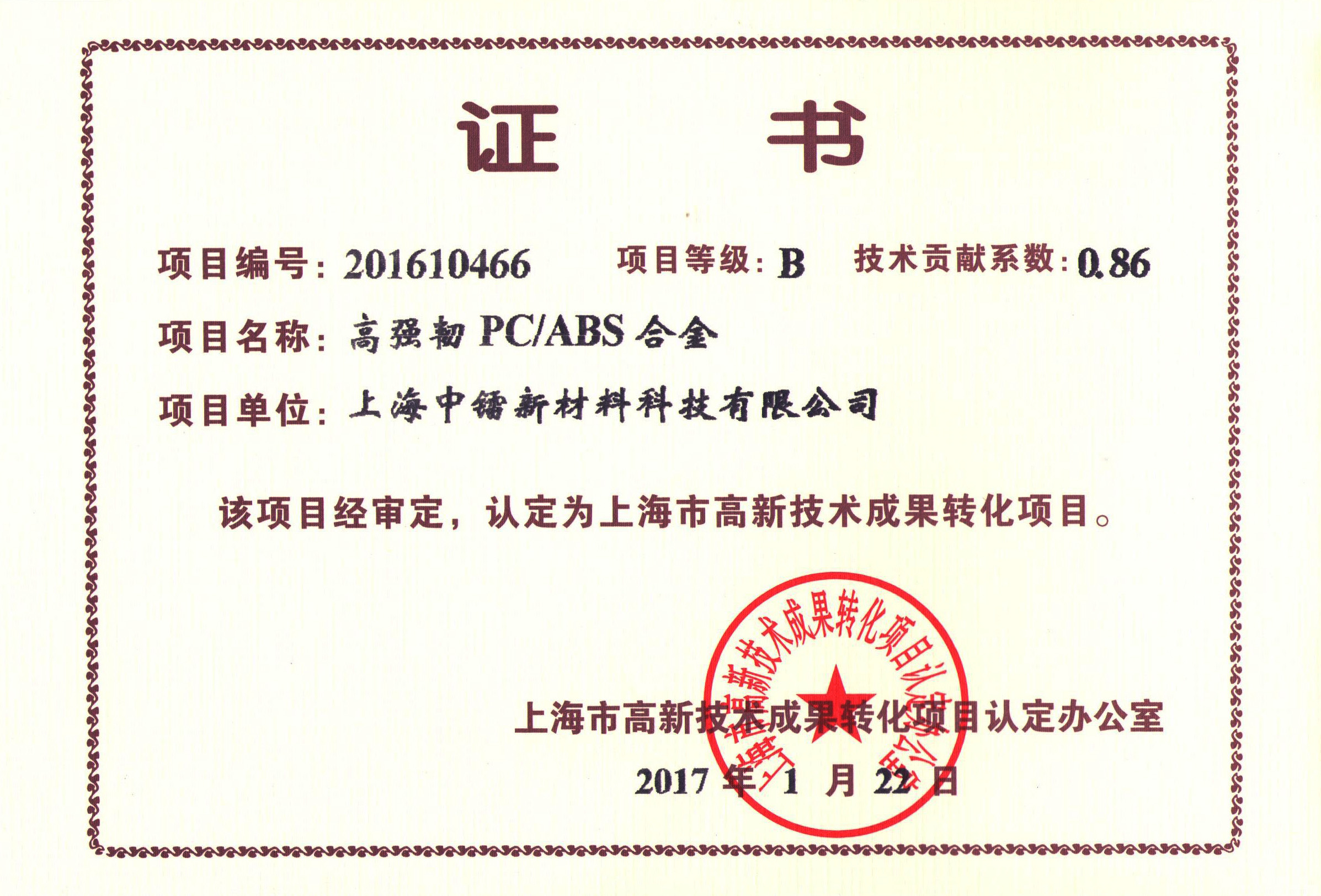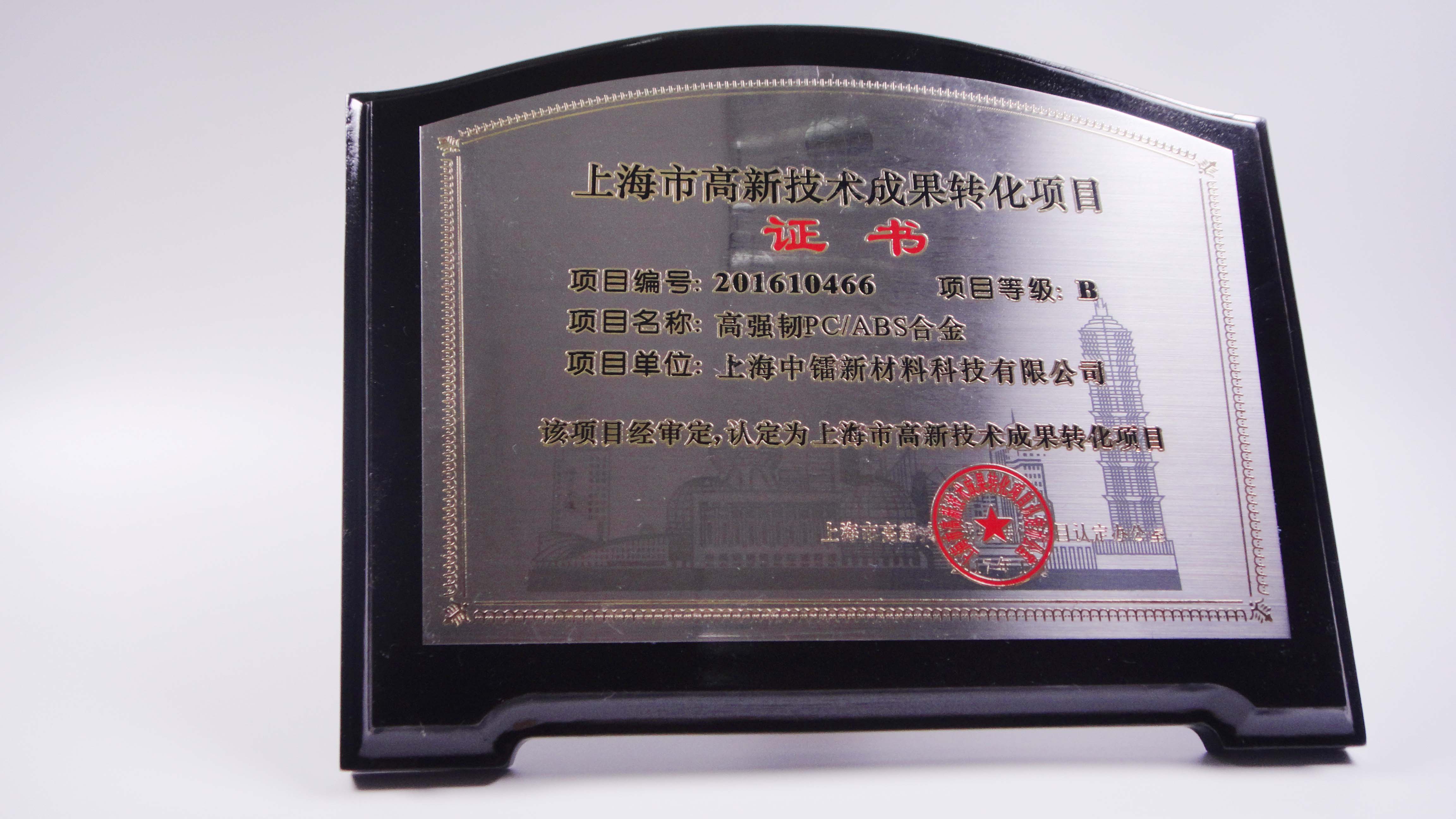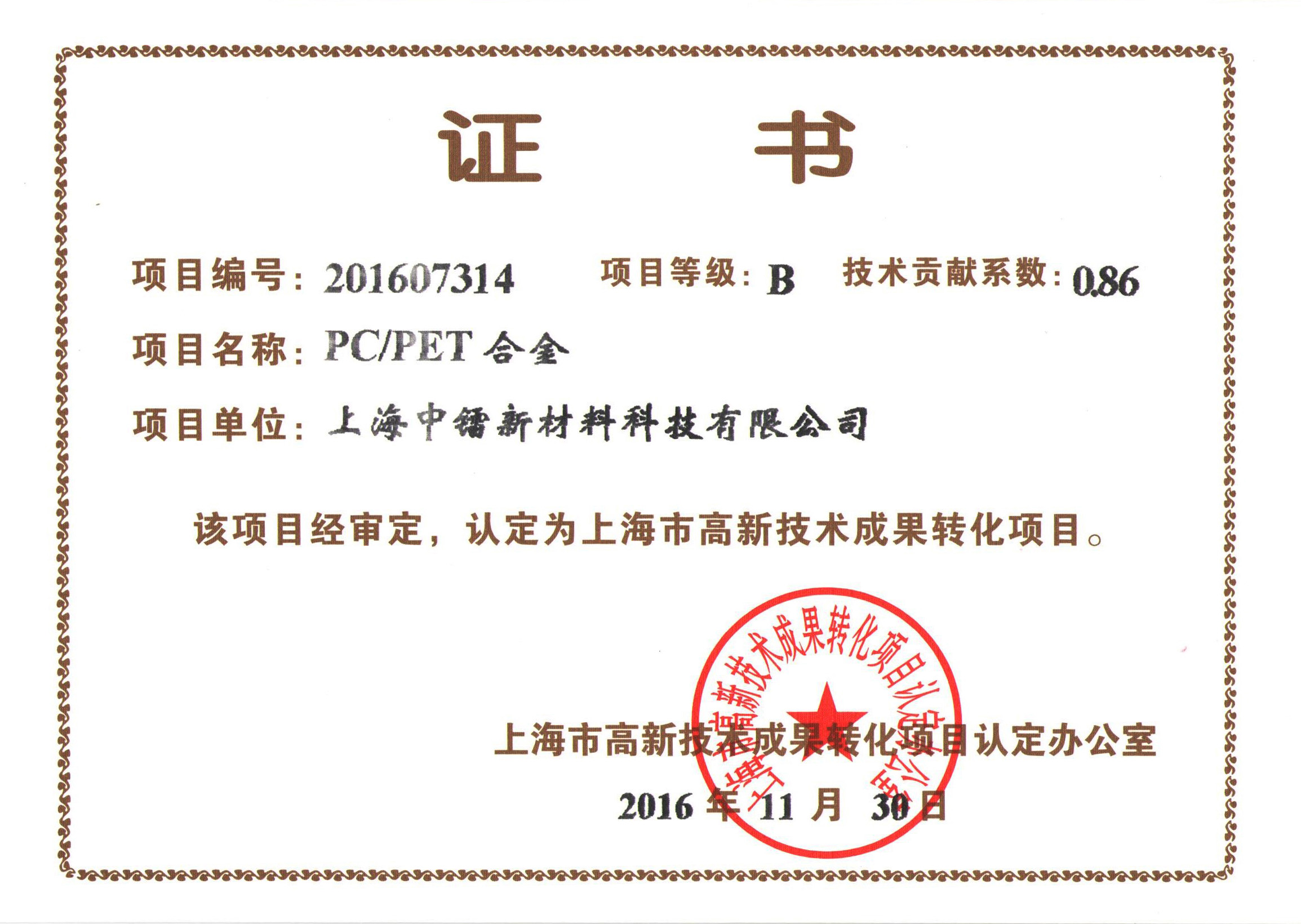 PC/PET合金成果轉(zhuǎn)化證書