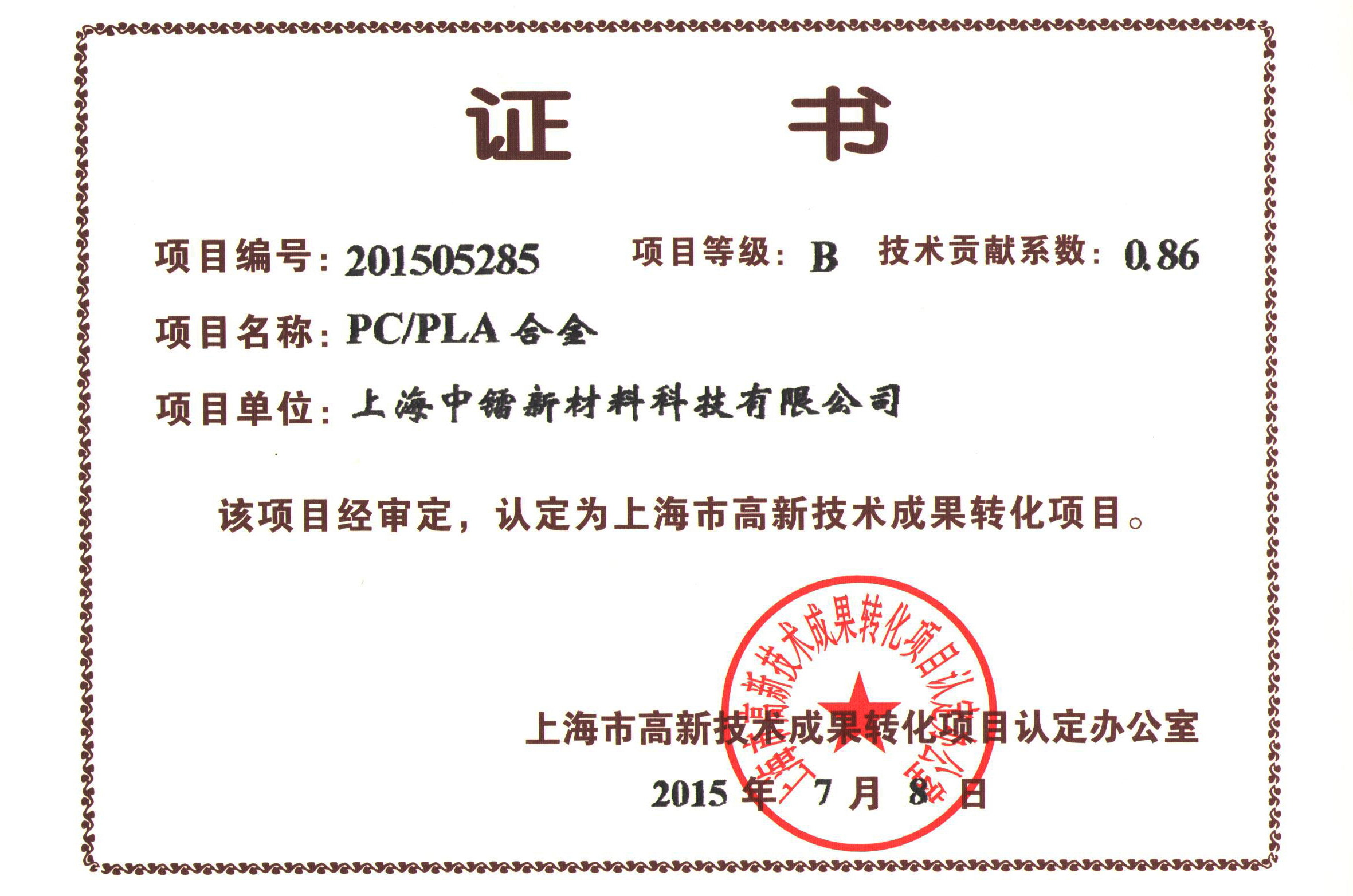 成果轉(zhuǎn)化證書PCPLA合金