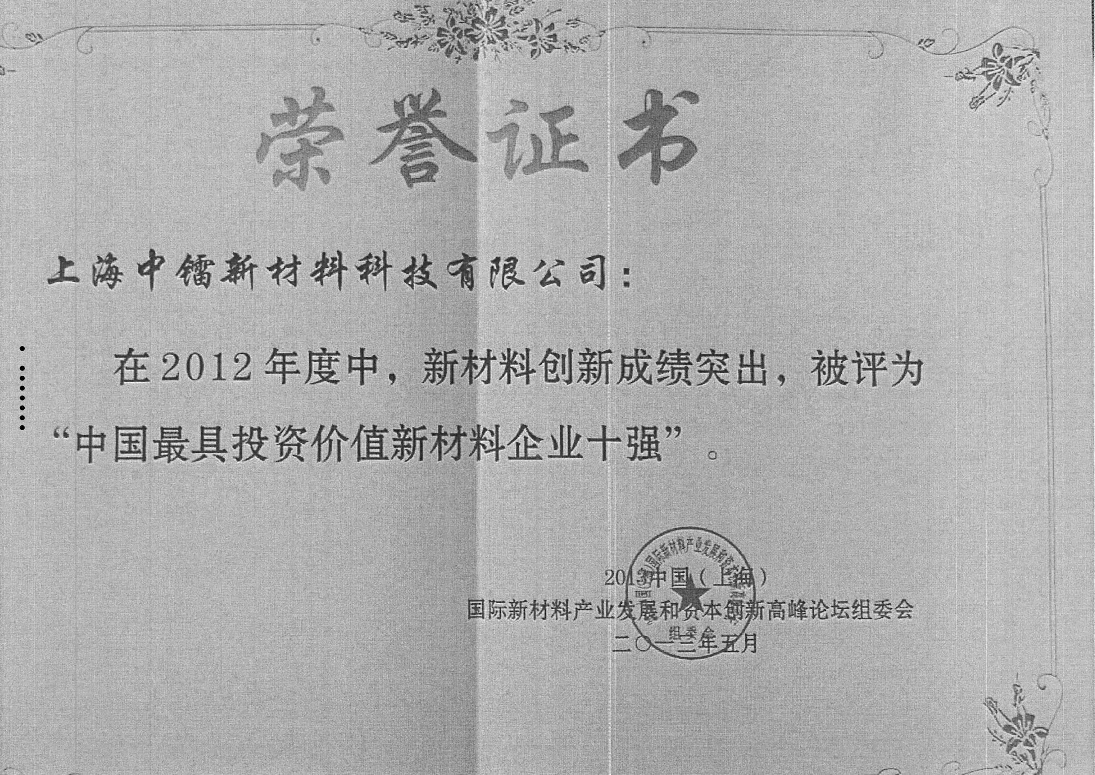 榮譽(yù)證書-2012中國最有投資價(jià)值新材料企業(yè)十強(qiáng)