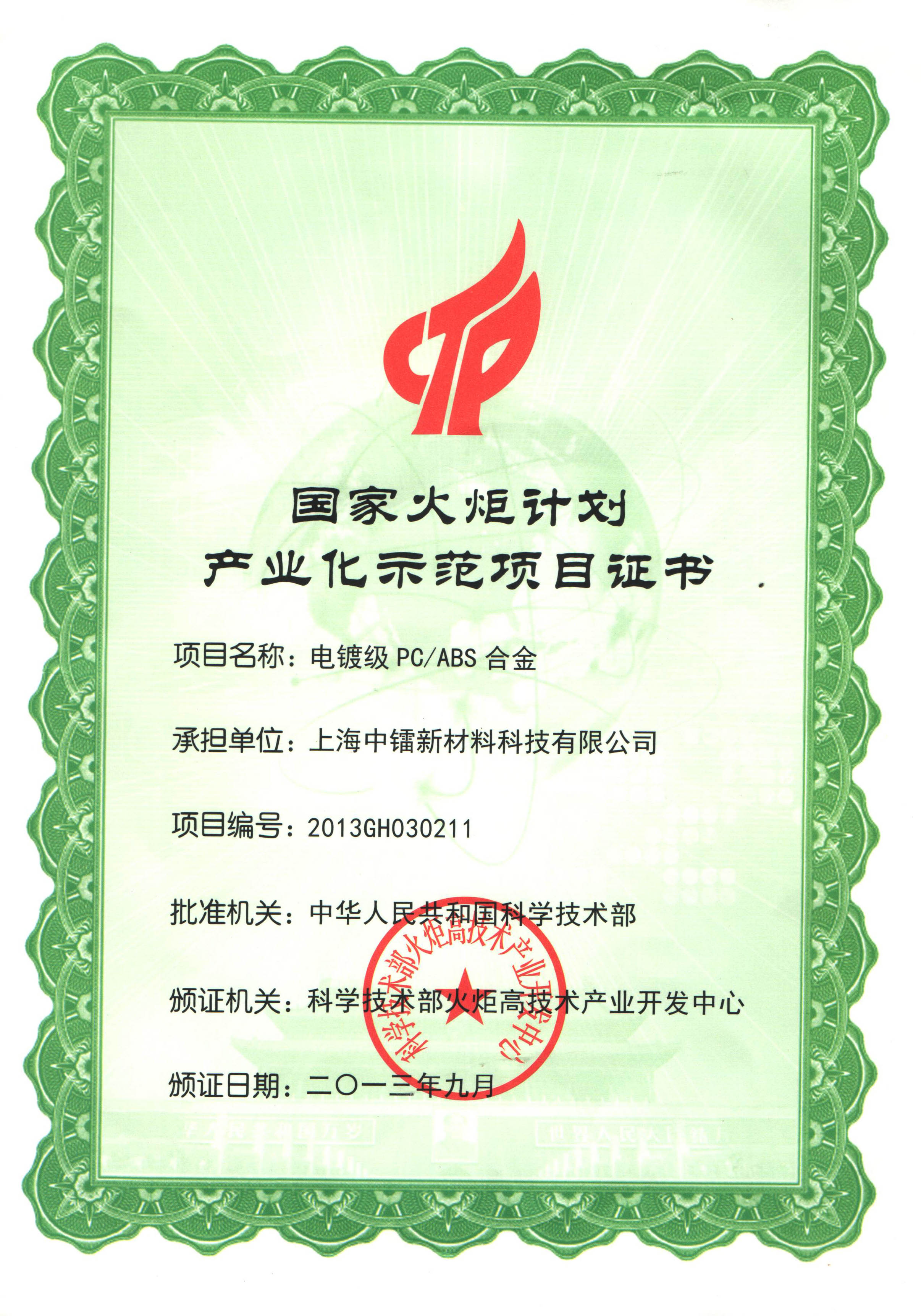 國家火炬計(jì)劃證書